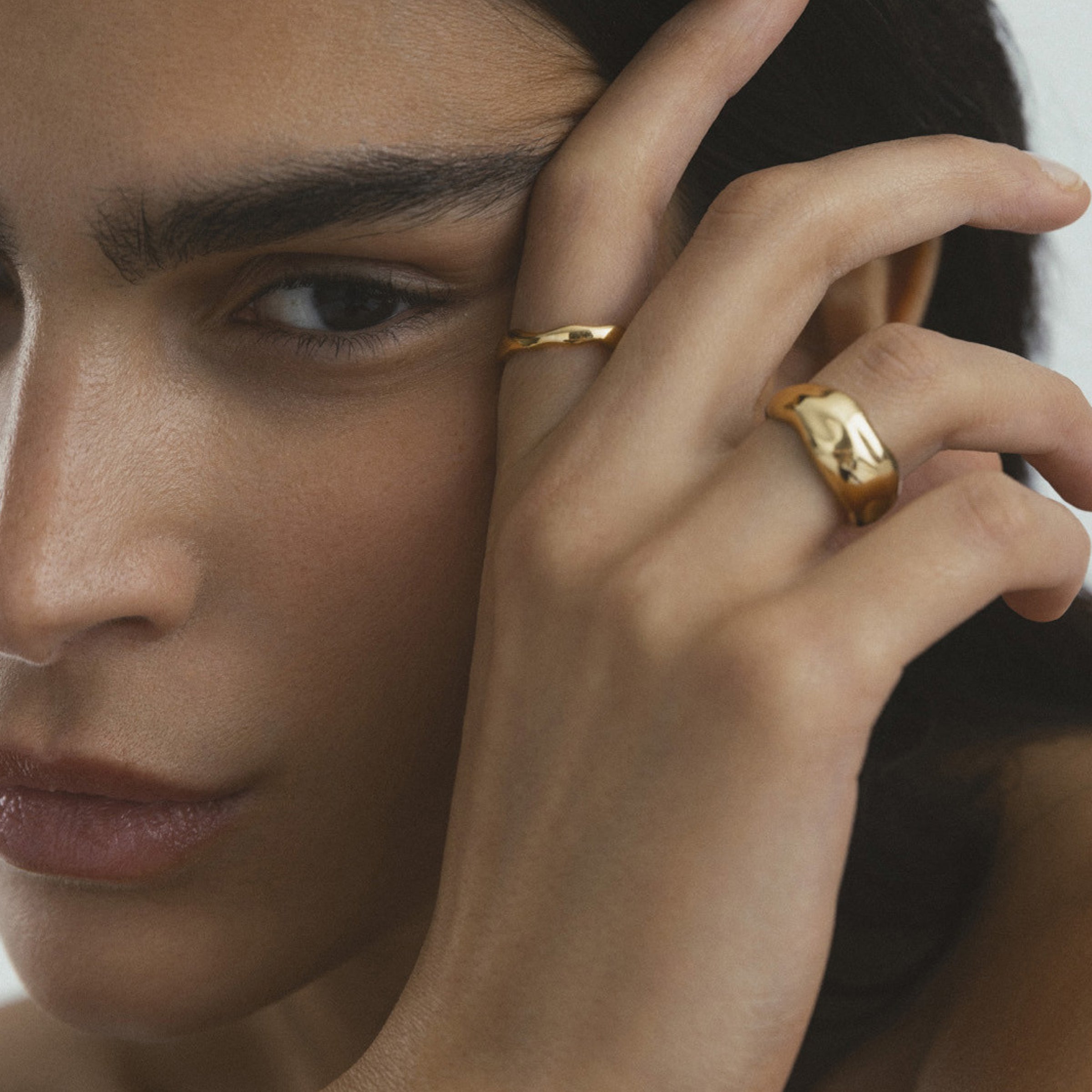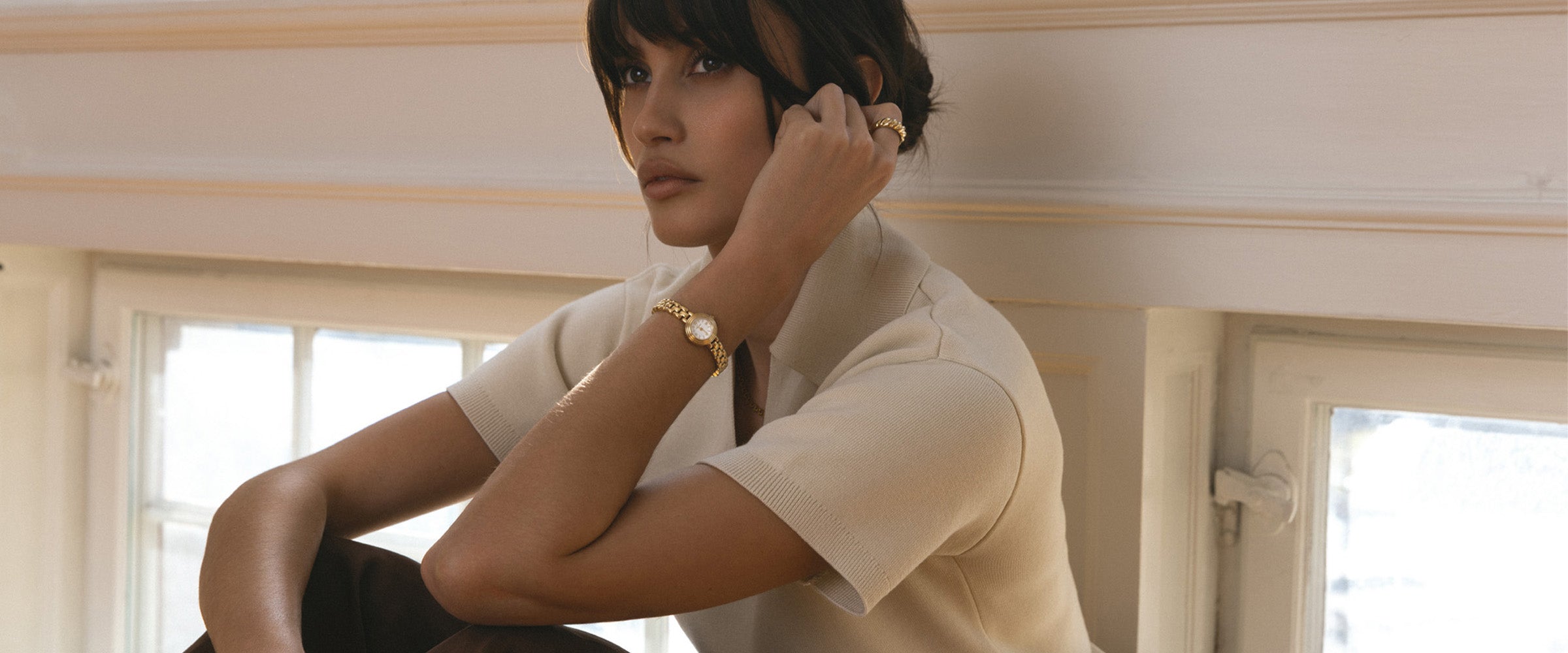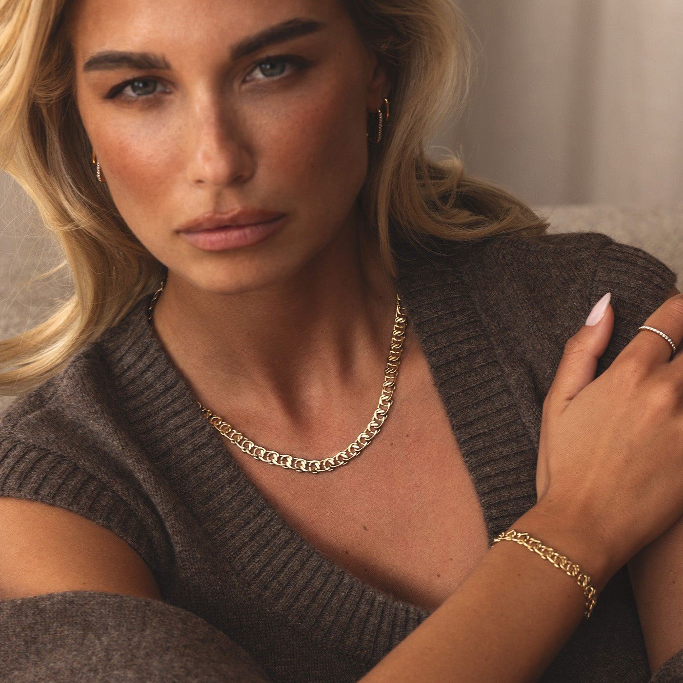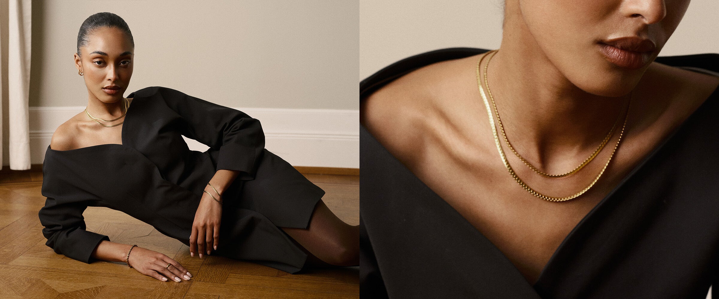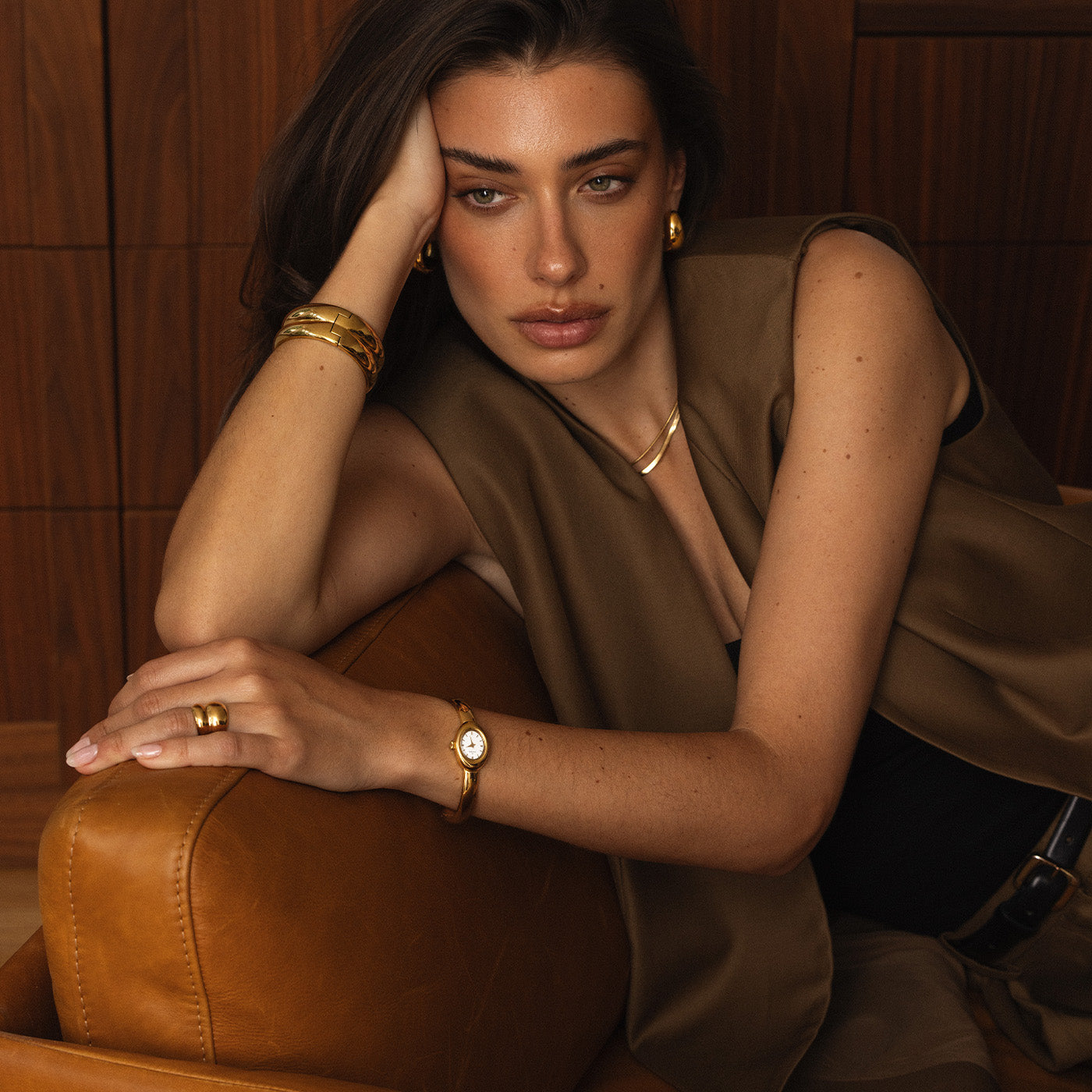 Bær guldsmykker og ure, der fremhæver varme brune nuancer med diskret elegance. Følg sæsonens tendenser med tidløse designs og omhyggeligt udførte detaljer – perfekt til en hyggelig dag eller en særlig aften.
