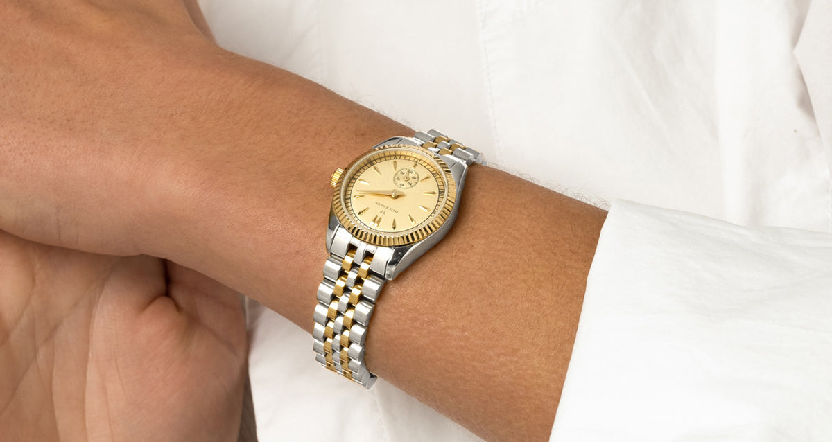Vores BIC-ure i rustfrit stål kombinerer farverne sølv og guld i et tidløst design af høj kvalitet.