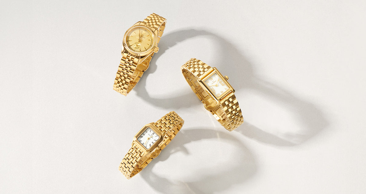 Guldfarvede ure i rustfrit stål med PVD-belægning og et tidløst design.