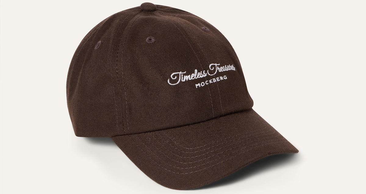 Udforsk vores merch – kasketter i brun og beige med et diskret Mockberg-logo.