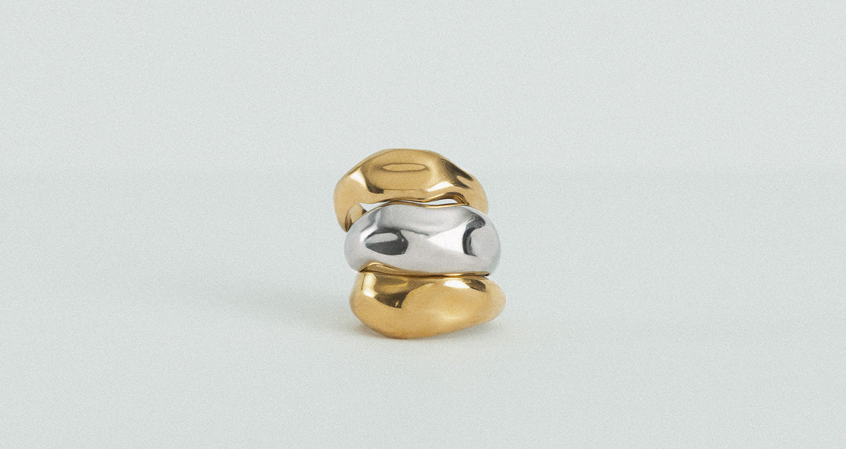 En kollektion af statement-ringe, kendetegnet ved markante silhuetter og unikke detaljer. Fremstillet i rustfrit stål af høj kvalitet og fås i sølvfarvet og guldfarvet.