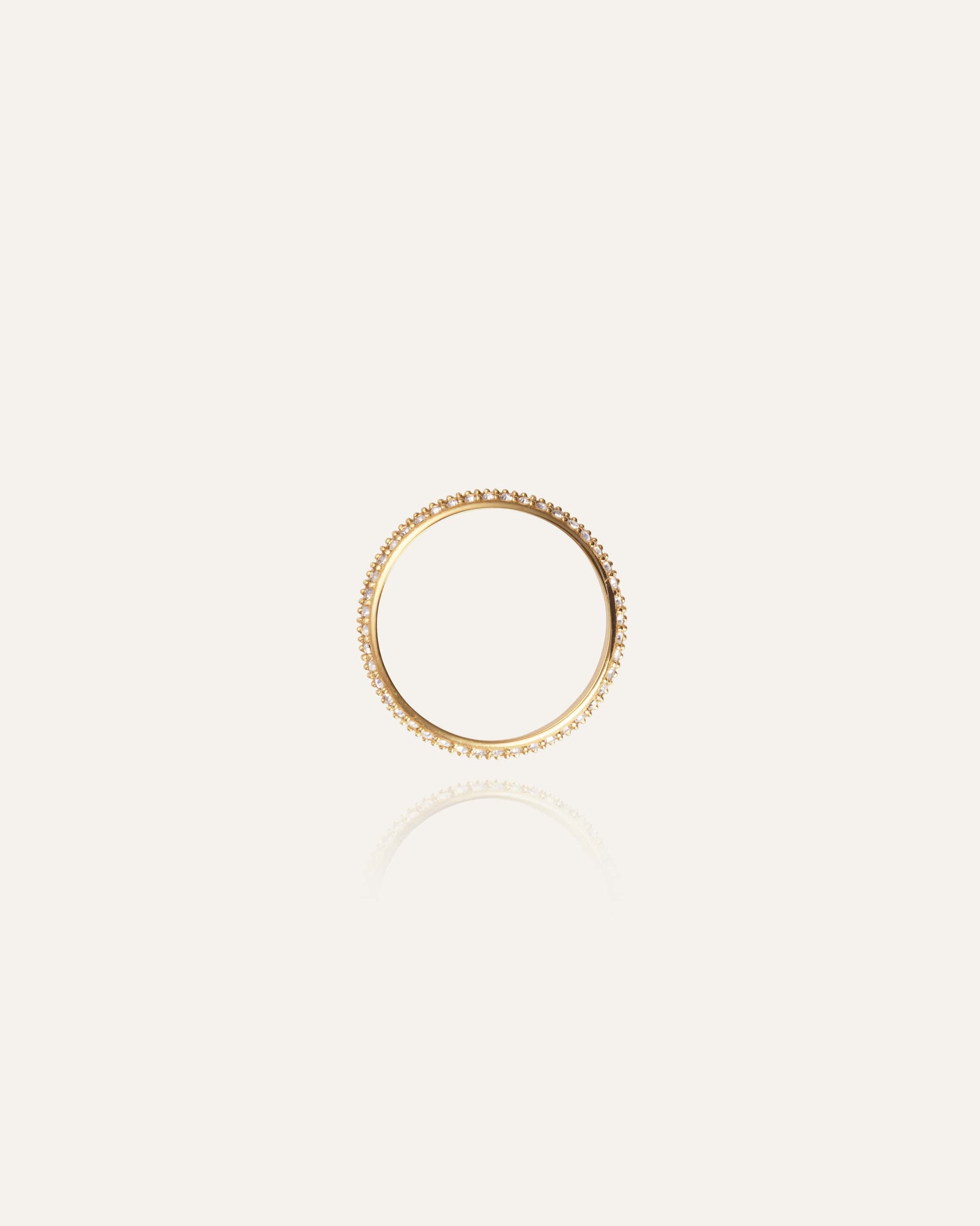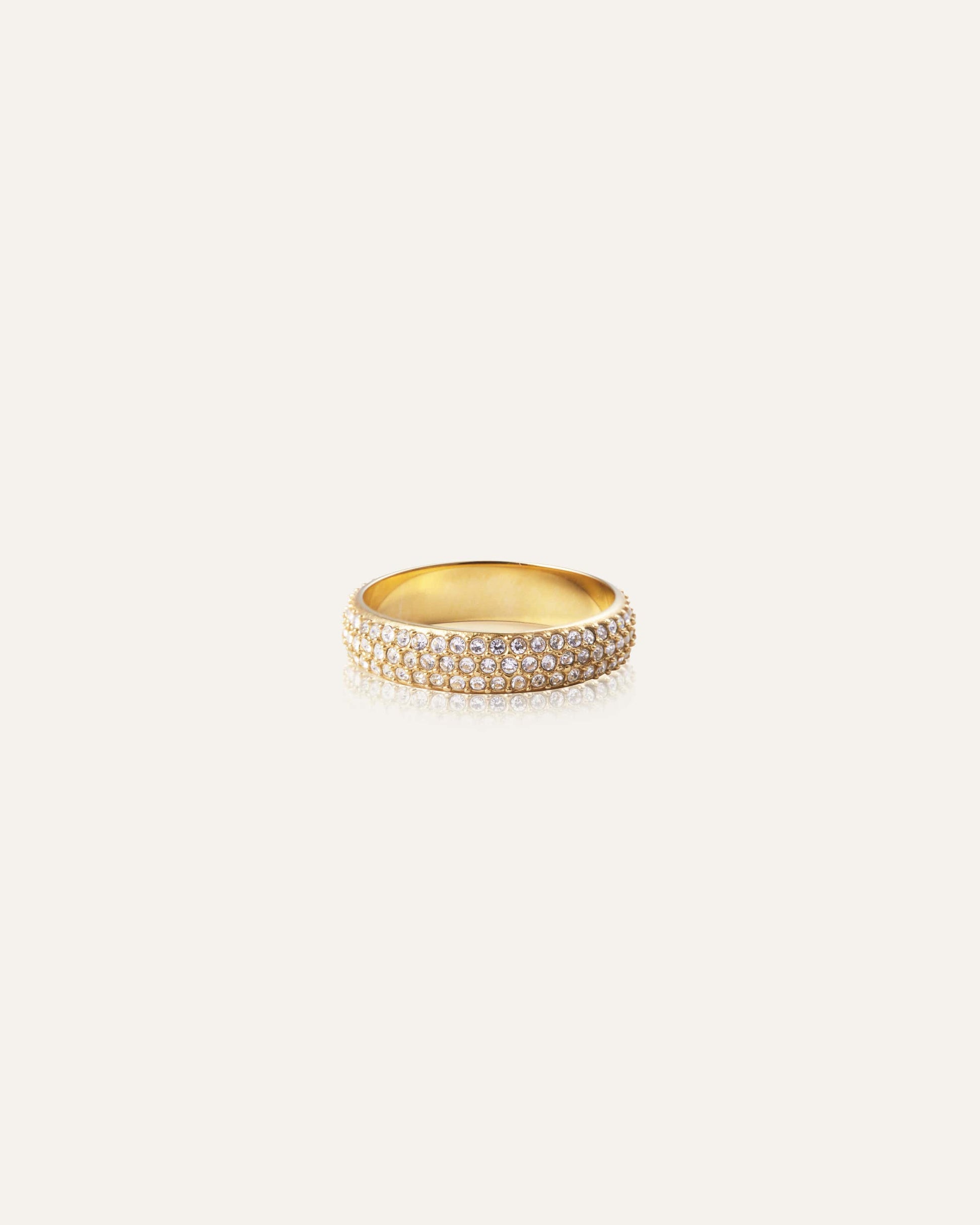 En klassisk ring dekoreret med zirkoniasten hele vejen rundt. Perfekt at bære alene eller kombinere med andre ringe for et lag-på-lag-look. Fremstillet af massivt rustfrit stål med 18K guldfarvet PVD-belægning – vandafvisende og slidstærk. Brug den hver dag – svøm, gå i bad og træn uden at bekymre dig om, at den mister farven.