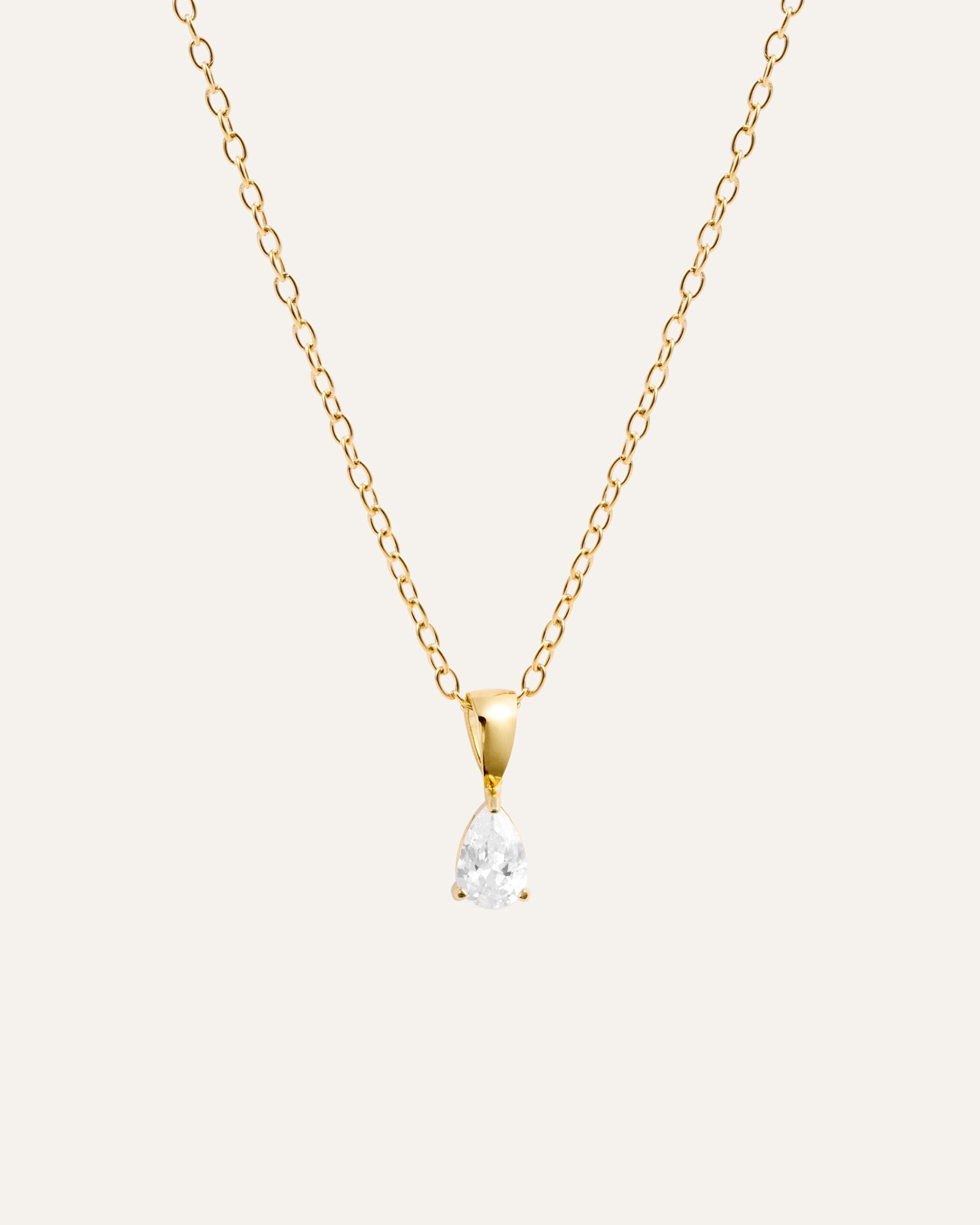 Belle White Necklace er en minimalistisk halskæde med en dråbeformet hvid sten fastgjort til en tynd kæde. Fremstillet i rustfrit stål med 18K guldfarvet PVD-belægning – slidstærk og vandafvisende, så den bevarer både farve og glans over tid.
