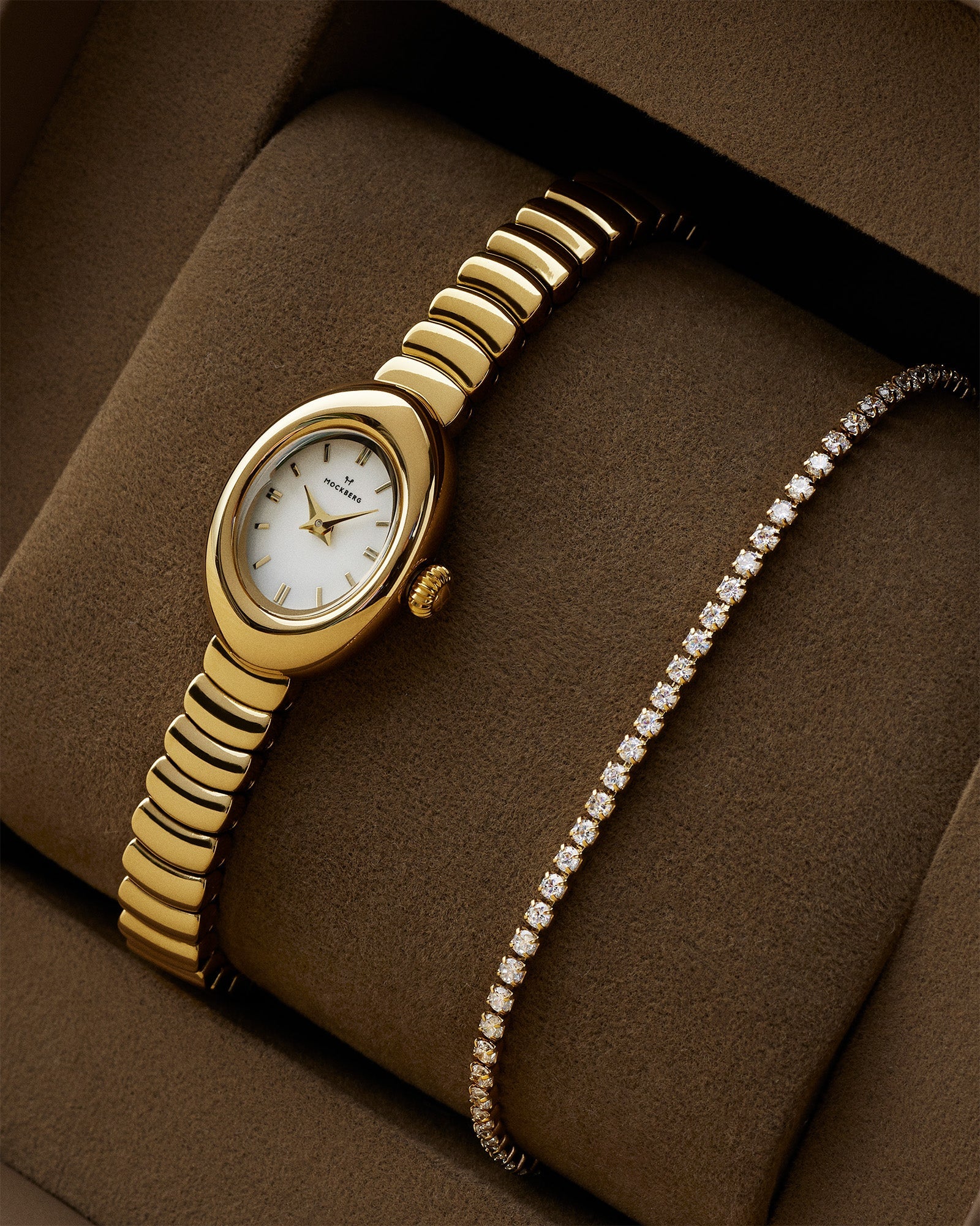 Mockberg’s gift set with the Belle Oval Petite watch and bracelet delivers a classic, cohesive look that works beautifully for both everyday wear and special occasions. The combination is easy to wear and elevates your style without being overpowering. The watch and bracelet are delivered together in a gift box.