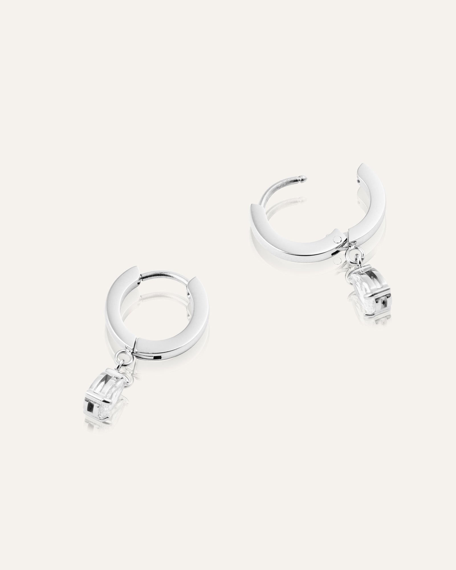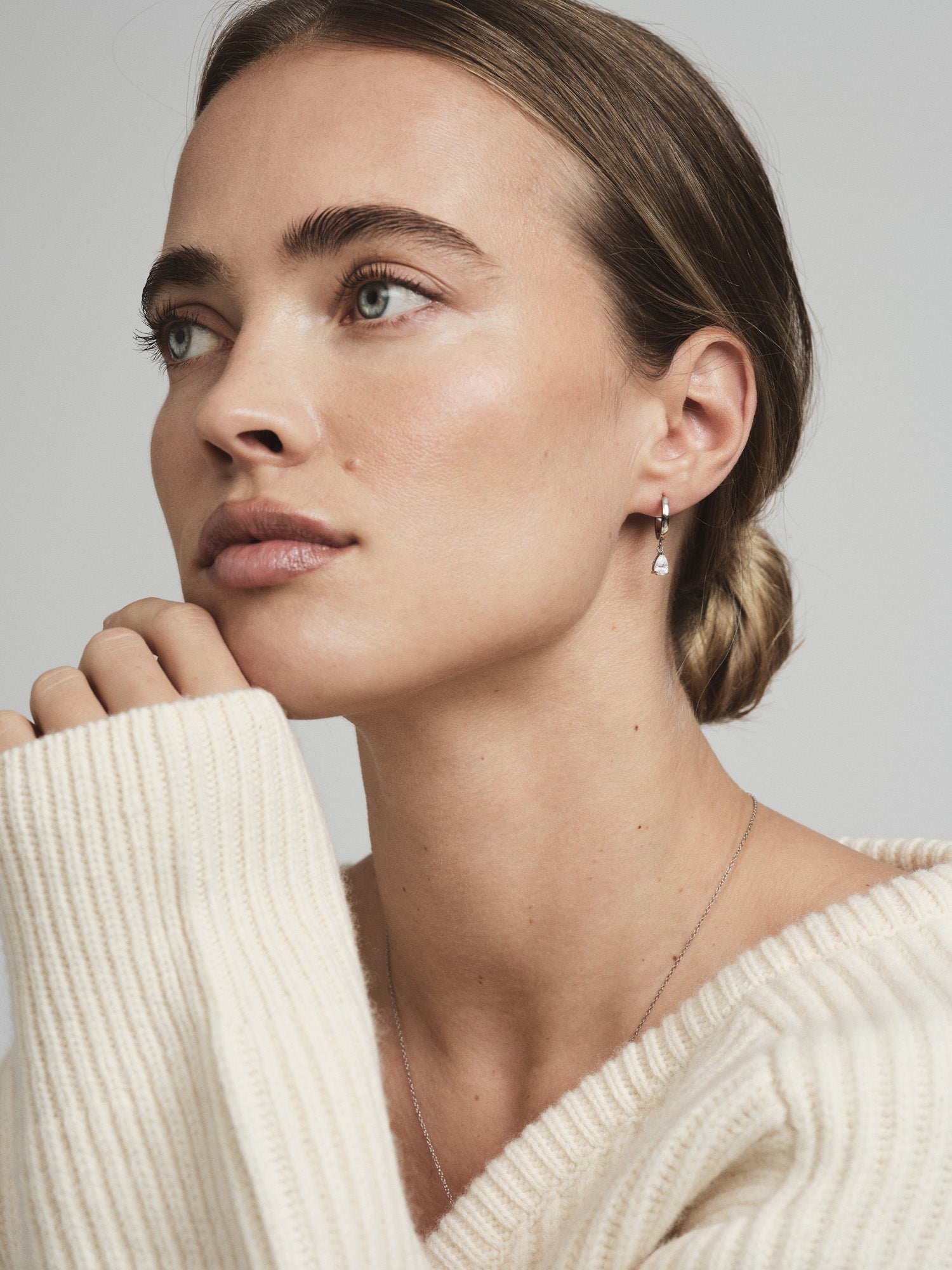 Belle White Hoops er en moderne fortolkning af vores klassiske hoops. De hvide dråbeformede sten i en sølvfarvet ramme gør dem til det perfekte tilbehør til enhver anledning. Fremstillet i rustfrit stål – slidstærke og vandafvisende.