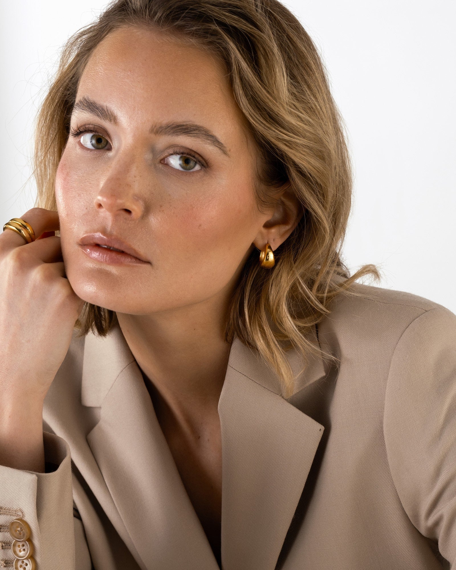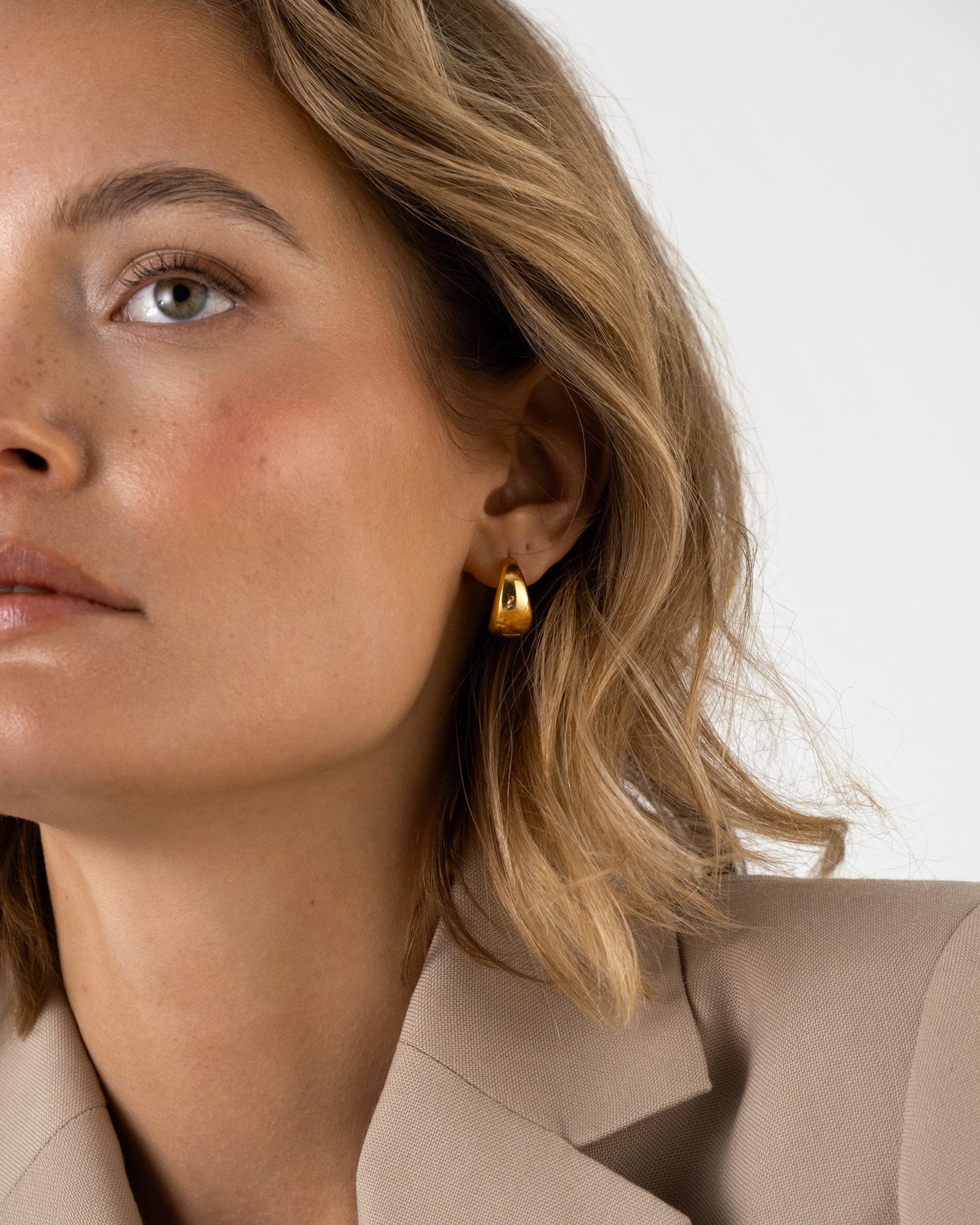 Hoop-øreringe i et slidstærkt design, fremstillet i massivt rustfrit stål med 18K guldfarvet PVD-belægning. Vandafvisende og robuste – de bevarer både farve og elegance over tid.