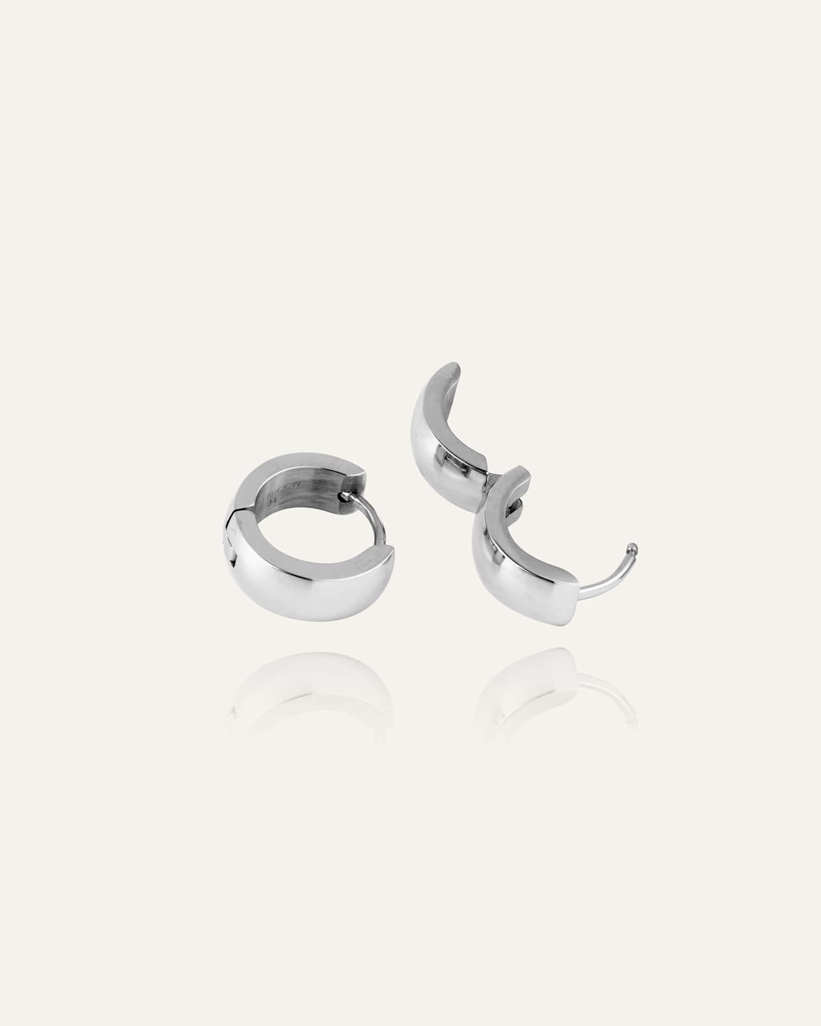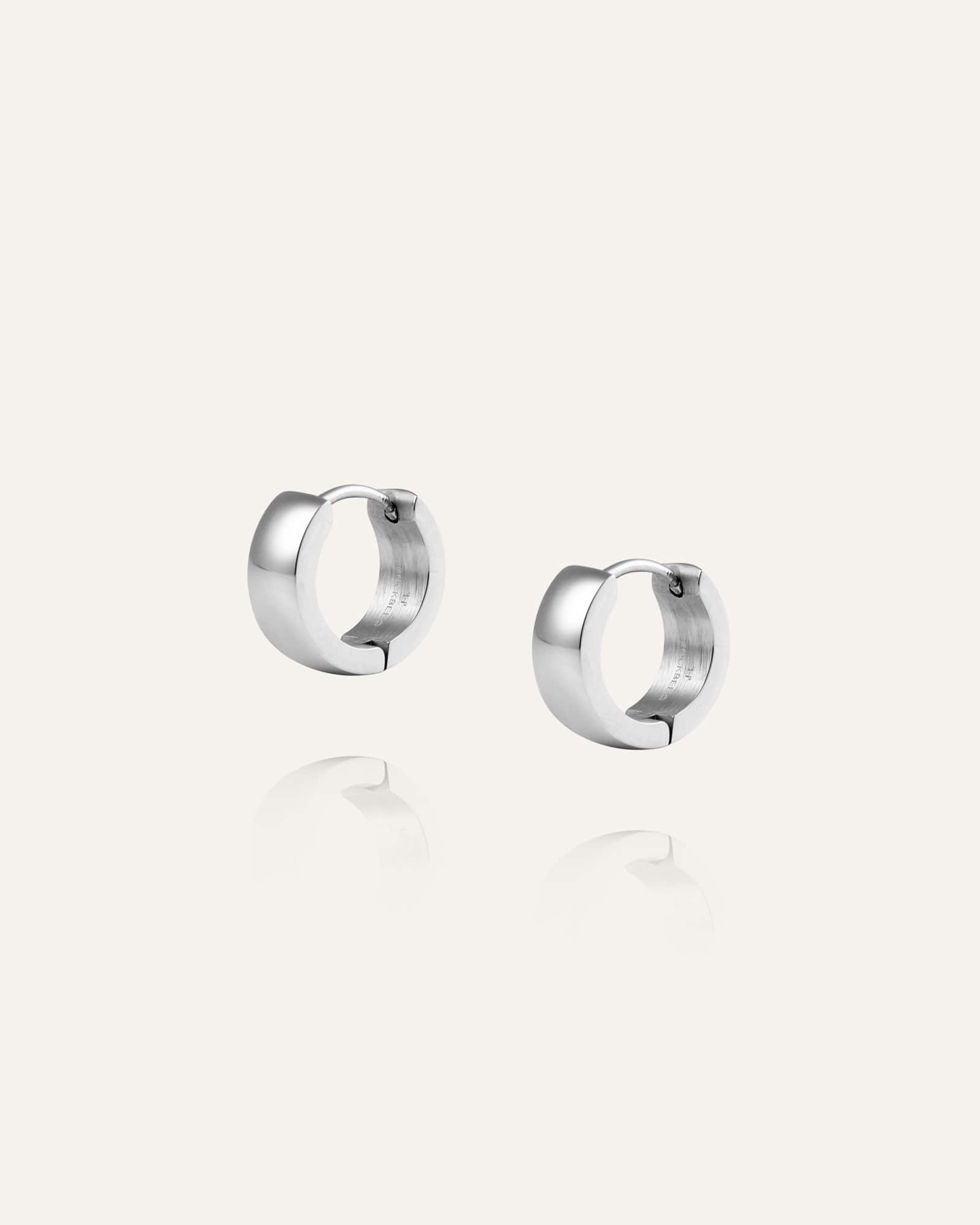 Klassiske hoop-øreringe fremstillet i massivt rustfrit stål. Slidstærke og vandafvisende – du kan både svømme og træne uden at bekymre dig om, at de mister farven.