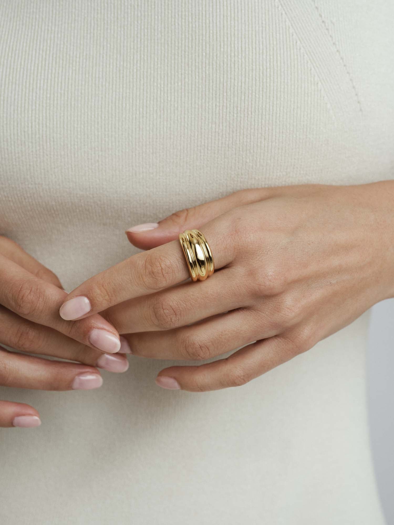 Deco Ribbed Ring har et bredt design med tre hævede, afrundede striber langs den polerede overflade. Ringen er fremstillet i massivt rustfrit stål med slidstærk 18K guldfarvet PVD-belægning. Den er vandafvisende og holdbar – brug den hver dag, svøm, træn og tag et bad uden at bekymre dig om, at farven falmer.