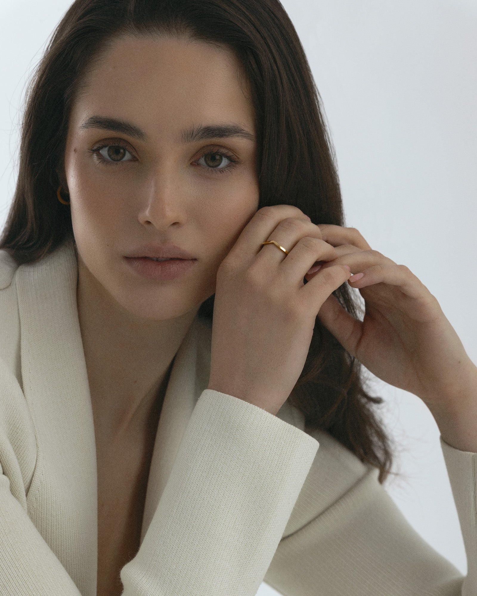 Honest Ring er en tynd og elegant ring med et V-formet design. Fremstillet i massivt rustfrit stål med 18K guldfarvet PVD-belægning – vandafvisende og slidstærk. Brug den hver dag – svøm, træn og gå i bad uden at bekymre dig om, at farven falmer.