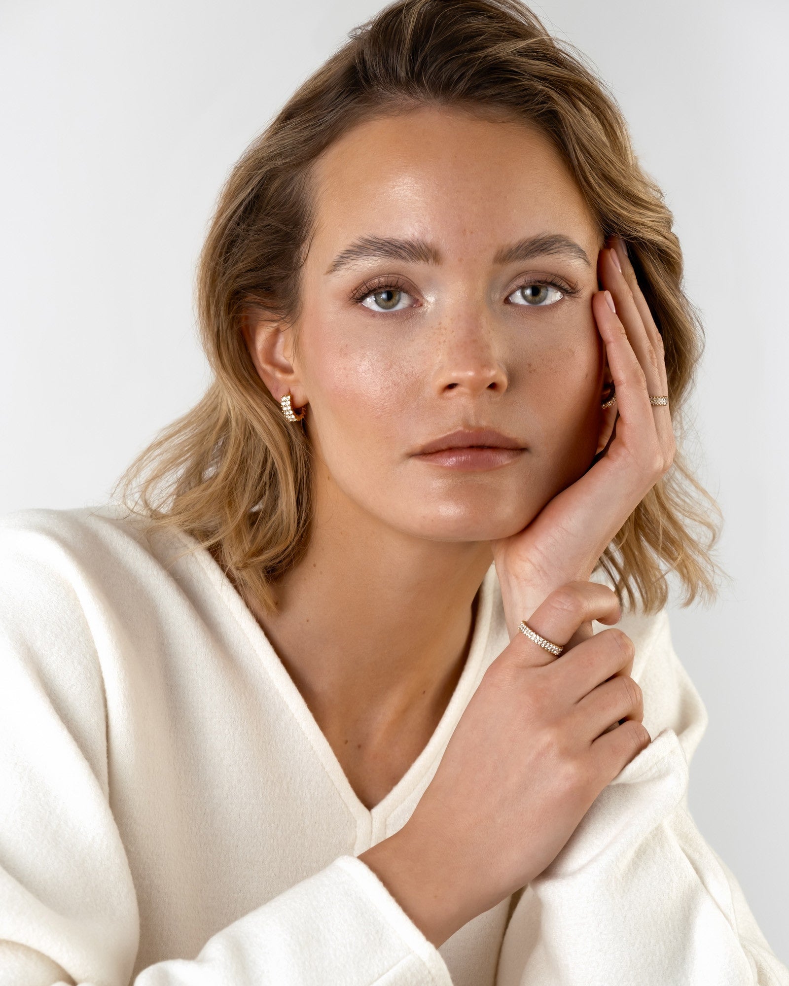Klassisk ring dækket af små funklende kubiske zirkonia. Fremstillet i messing med 18K guldfarvet PVD-belægning – vandafvisende og slidstærk. Brug den hver dag – svøm, gå i bad og træn uden at bekymre dig om, at farven falmer.