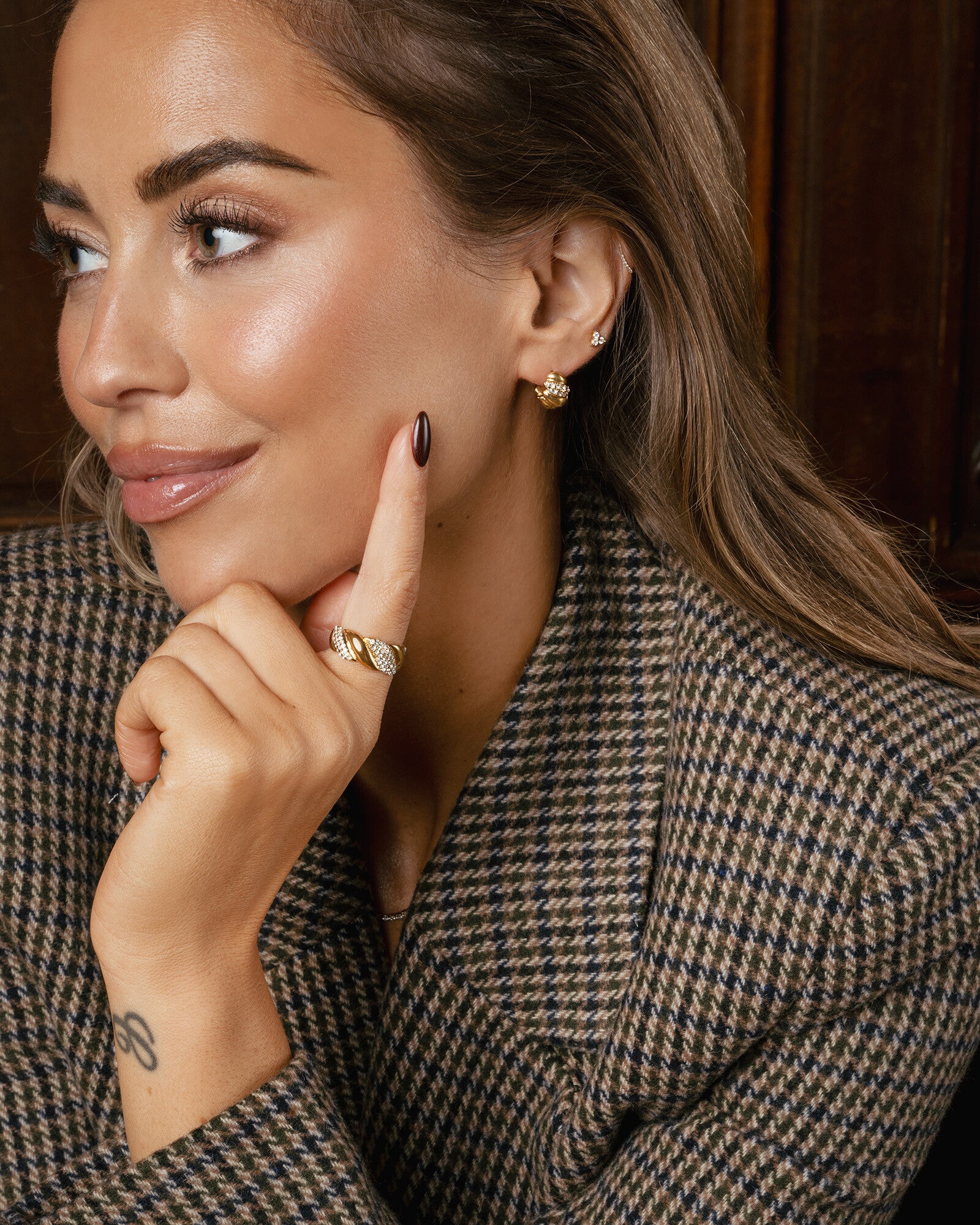 Warm shine and a twisted shape with white Preciosa stones that beautifully catch the light. A pair that brings presence without overpowering – perfect on their own or layered.