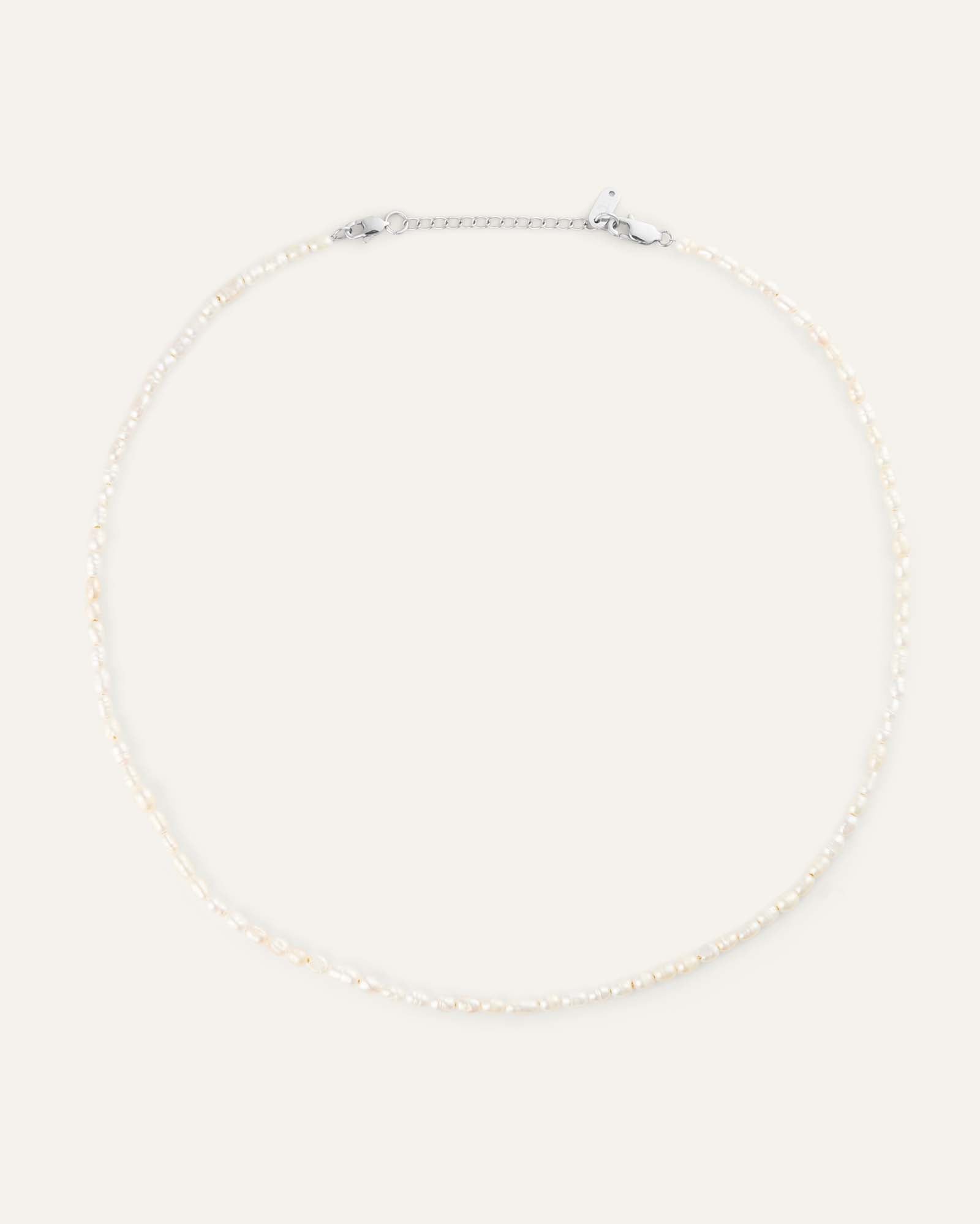 The Pearl Steel Necklace is a subtle pearl necklace where natural freshwater pearls add a soft glow close to the skin. The pearls are strung on a stainless steel chain with a 50 mm extension, making it easy to adjust the length to suit your style. The short length places the necklace beautifully at the collarbones and makes it perfect for both everyday wear and festive occasions.