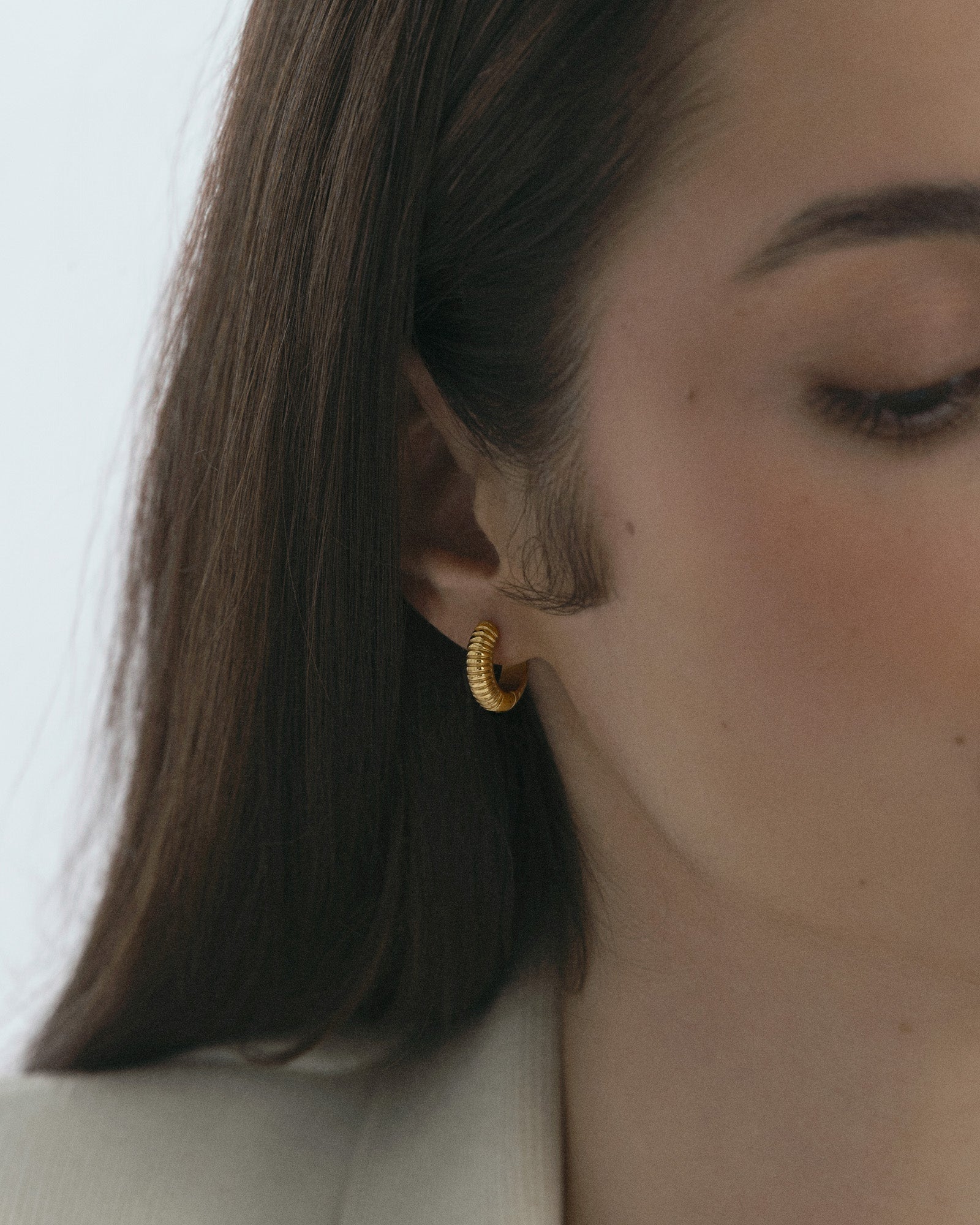 Ribbed Hoops har et unikt design med en riflet tekstur, der skiller sig ud fra de klassiske Everyday Hoops. Fremstillet af massivt rustfrit stål med 18K guldfarvet PVD-belægning – slidstærke og vandafvisende, og bevarer både farve og stil over tid.