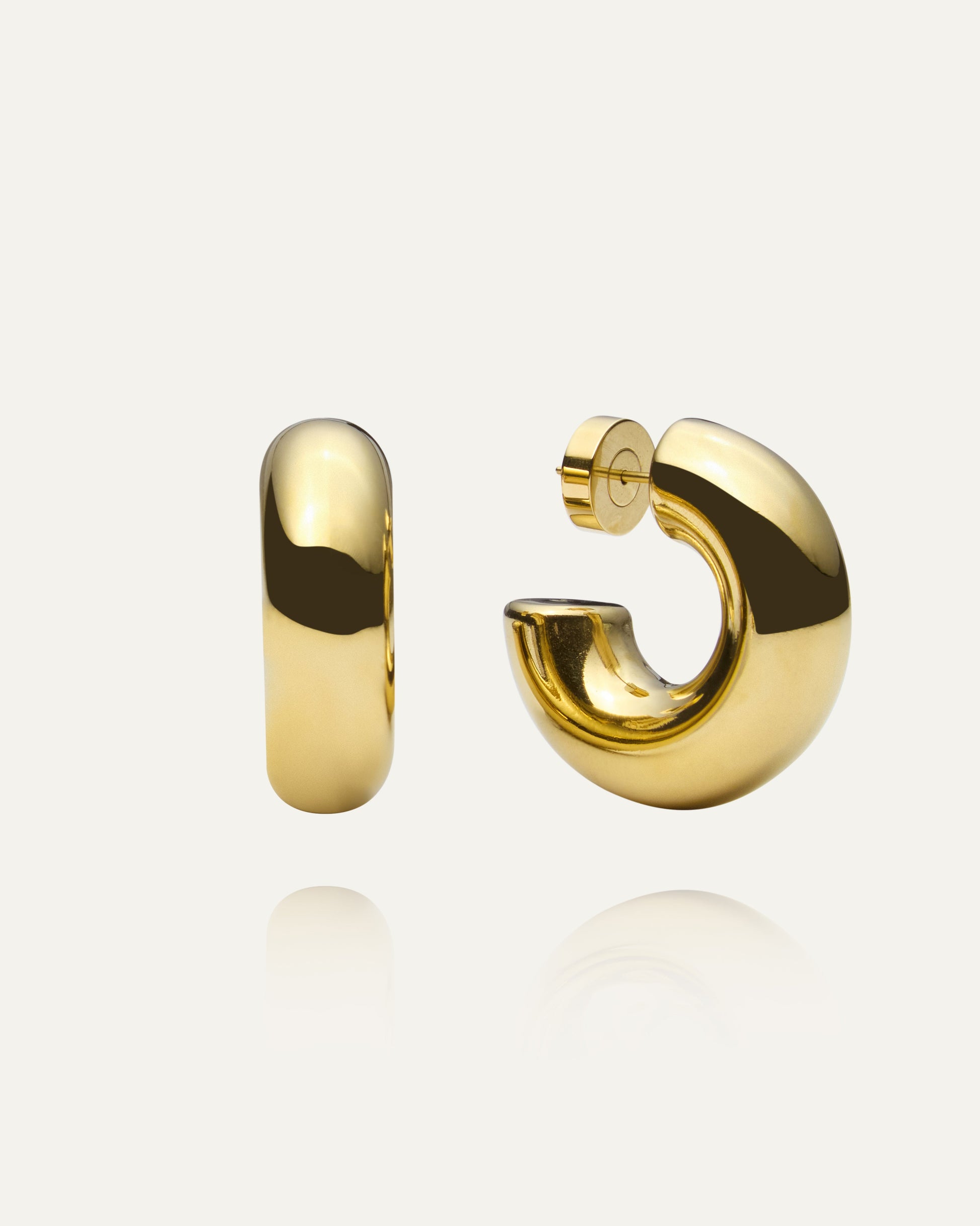 Rude Bold Earrings er et par statement-øreringe med en markant form og en generøs størrelse på 32 mm. Fremstillet af rustfrit stål med 18K guldfarvet PVD-belægning – slidstærke og vandafvisende, og bevarer både farve og glans over tid.