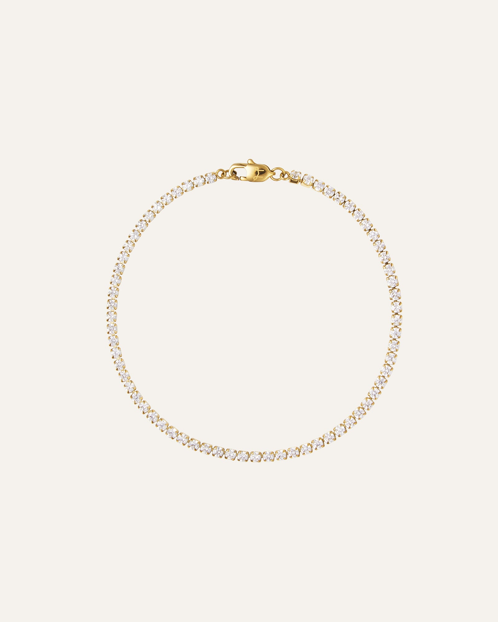 Shiny Tennis Bracelet er et armbånd designet med funklende kubiske zirkonia-sten, der løber langs hele kæden. Fremstillet af rustfrit stål med 18K guldfarvet PVD-belægning – både slidstærkt og vandafvisende, så det bevarer sin farve og glans over tid.