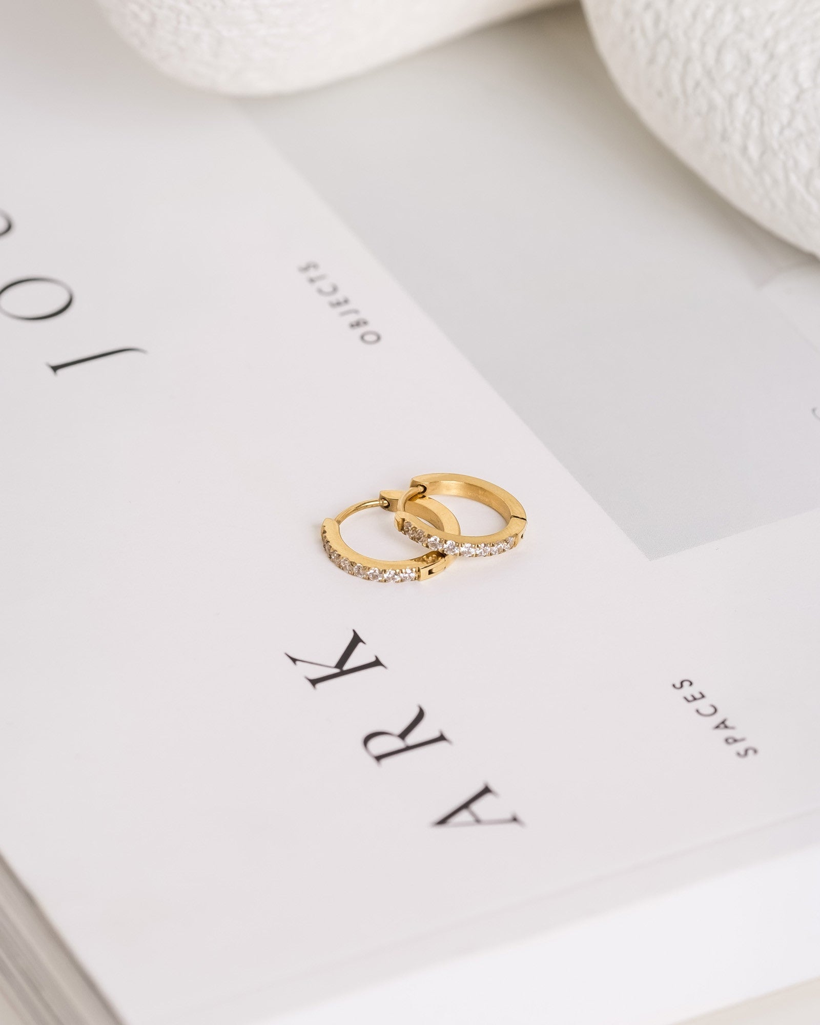Tidløse hoops med kubiske zirkonia-sten, fremstillet af massivt rustfrit stål med 18K guldfarvet PVD-belægning. Slidstærke og vandafvisende – de bevarer deres farve og elegance over tid. Perfekte at kombinere med vores Classic Hoops.