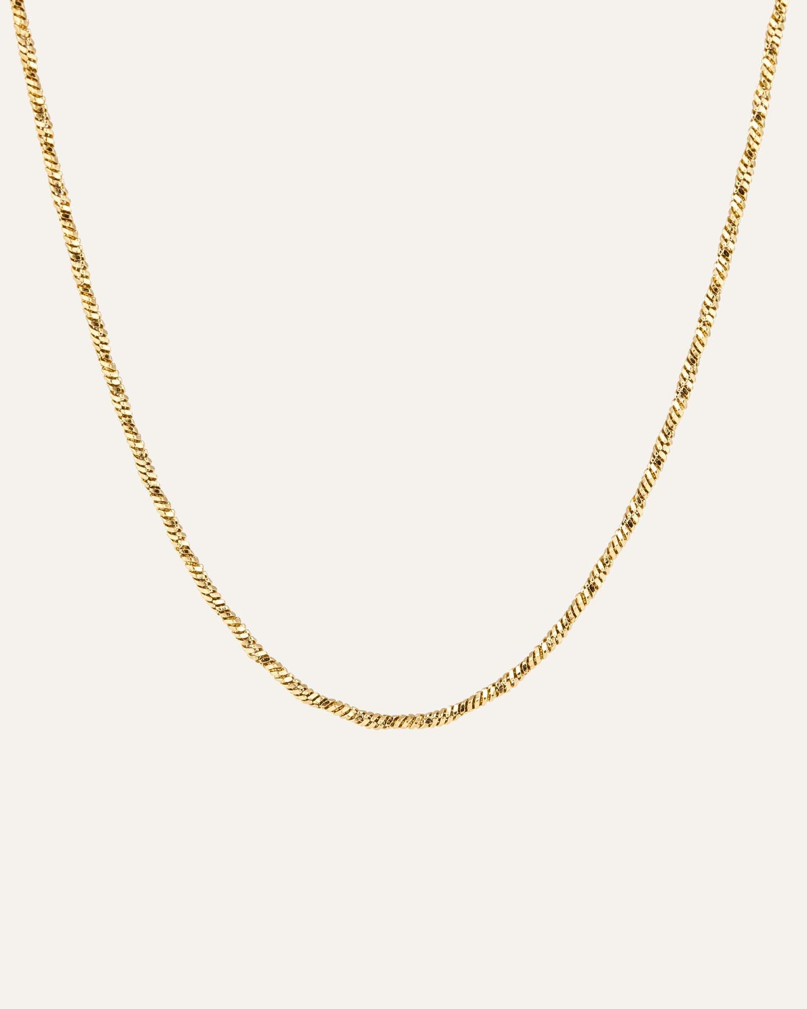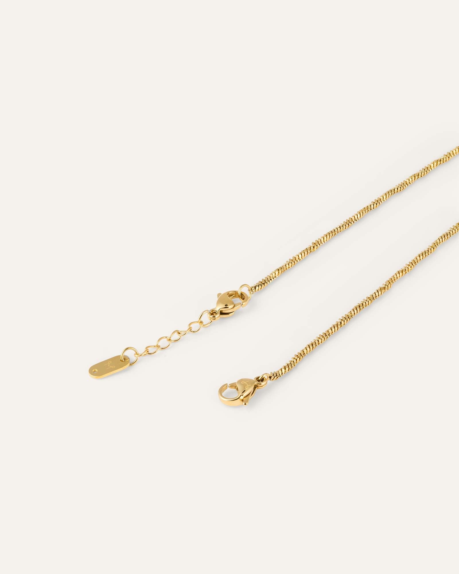 A chain that catches the light with every move. The fine mesh sits smoothly on the skin and adds a soft, confident glow. Water‑resistant for daily wear.