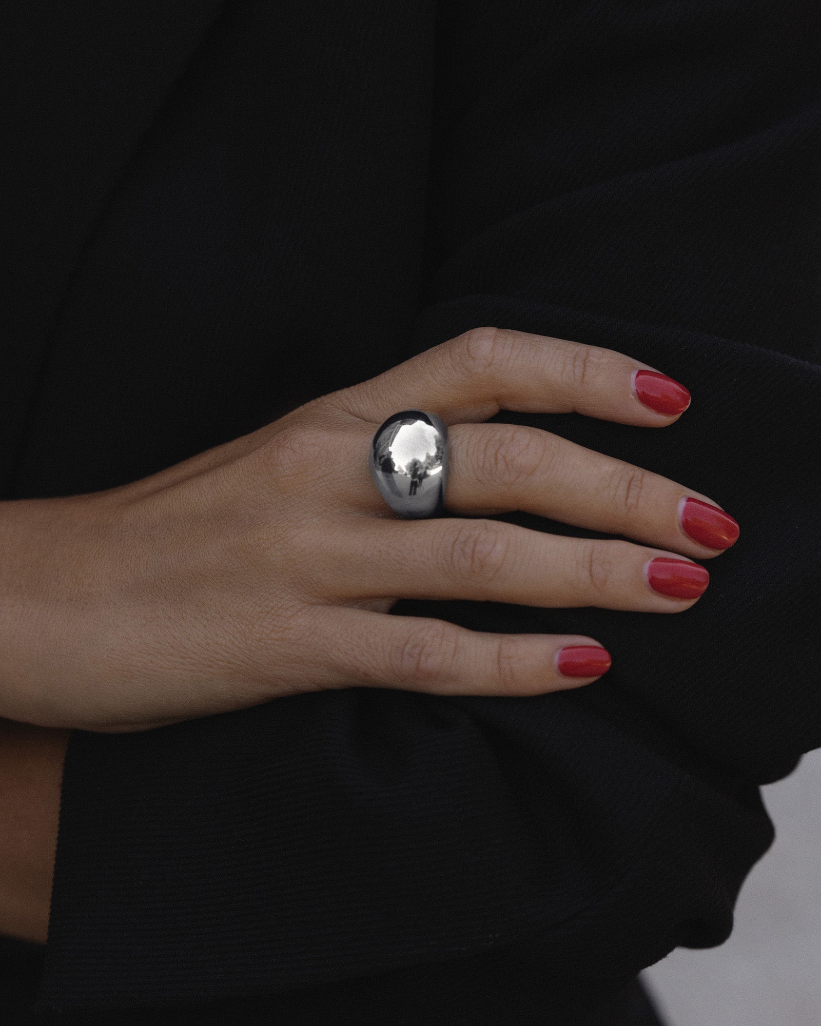 Sonja Ring er en bred, glat statement-ring med afrundede former og blank overflade. Ringen er inspireret af Sonja Kovalevsky – den første kvindelige professor i matematik, udnævnt i 1884. Hendes banebrydende arbejde og succes i en mandsdomineret akademisk verden er en stærk inspiration for os alle. Sonjas genialitet og vedholdenhed minder os om, at barrierer kan brydes, og at historien kan ændres. Bær Sonja Ring som en hyldest til kvindeligt lederskab og intellekt – og lad den være dit symbol på mod og succes i alle sammenhænge. Fremstillet af massivt rustfrit stål med holdbar PVD-belægning – vandafvisende og slidstærk. Brug den hver dag – svøm, tag brusebad og træn uden at bekymre dig om, at farven falmer.