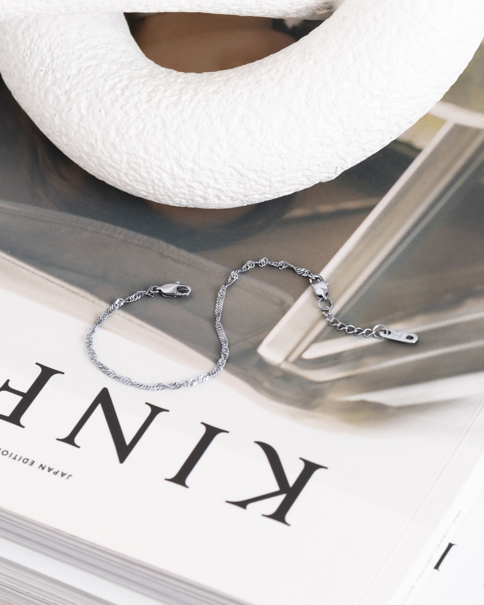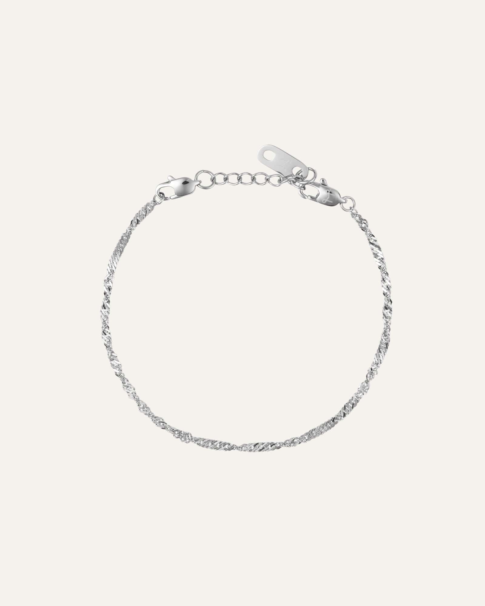 Twirl-armbåndet har et tyndt, snoet kædedesign – en tidløs detalje, der ser flot ud både alene og sammen med andre armbånd. Fremstillet i rustfrit stål med PVD-belægning – slidstærkt og vandafvisende, så det bevarer sin farve og glans over tid. Forlængerkæden kan nemt fjernes for en skræddersyet pasform.
